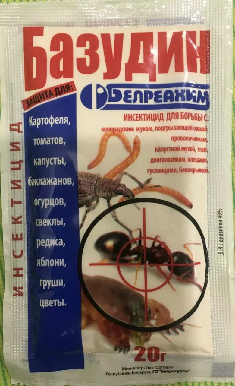 Защищает растение от почвенных вредителей: медведок, проволочников, сороконожек, долгоносиков, личинок мух. Базудин используют также для защиты зерна в зернохранилищах и складах. Препарат гарантирует: длительную защиту, борется с вредителями по трем направлениям: контактное поражение, кишечное и трансламинарное поражения.