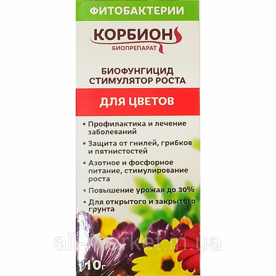 Биофунгицид и стимулятор роста "КОРБИОН" для цветов. Защита растений от гнилей, болезней, грибка. Стимулирует прорастание семян. Профилактика и лечение заболеваний. Для открытого и закрытого грунта. Норма расхода: 10 г на 10 л воды.