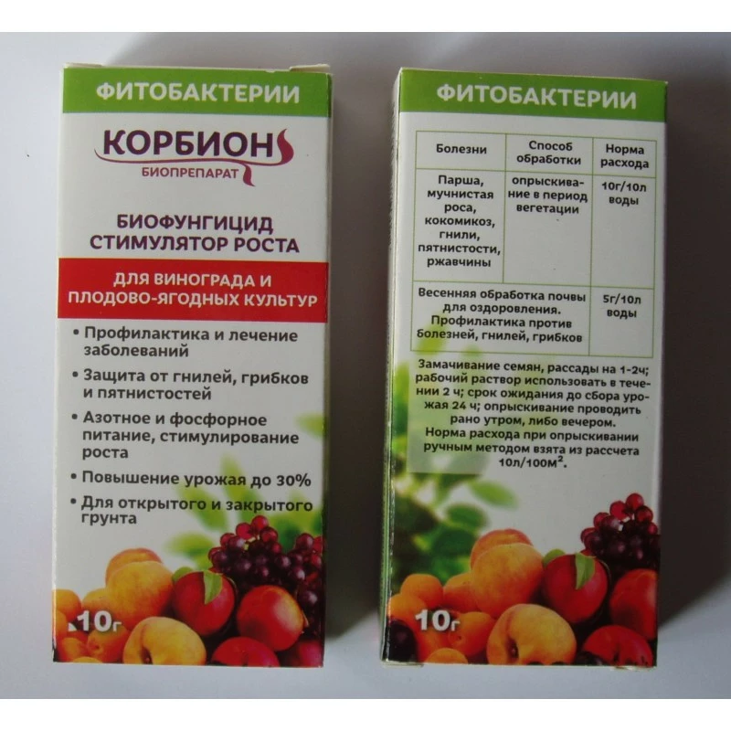 Биофунгицид и стимулятор роста "КОРБИОН" для винограда и плодово-ягодных культур. Защита растений от гнилей, болезней, грибка. Стимулирует прорастание семян. Повышает урожайность до 30%. Норма расхода: 10 г на 5 кг семян или 2 сотки.