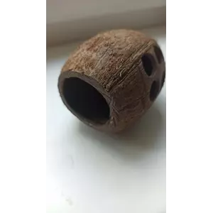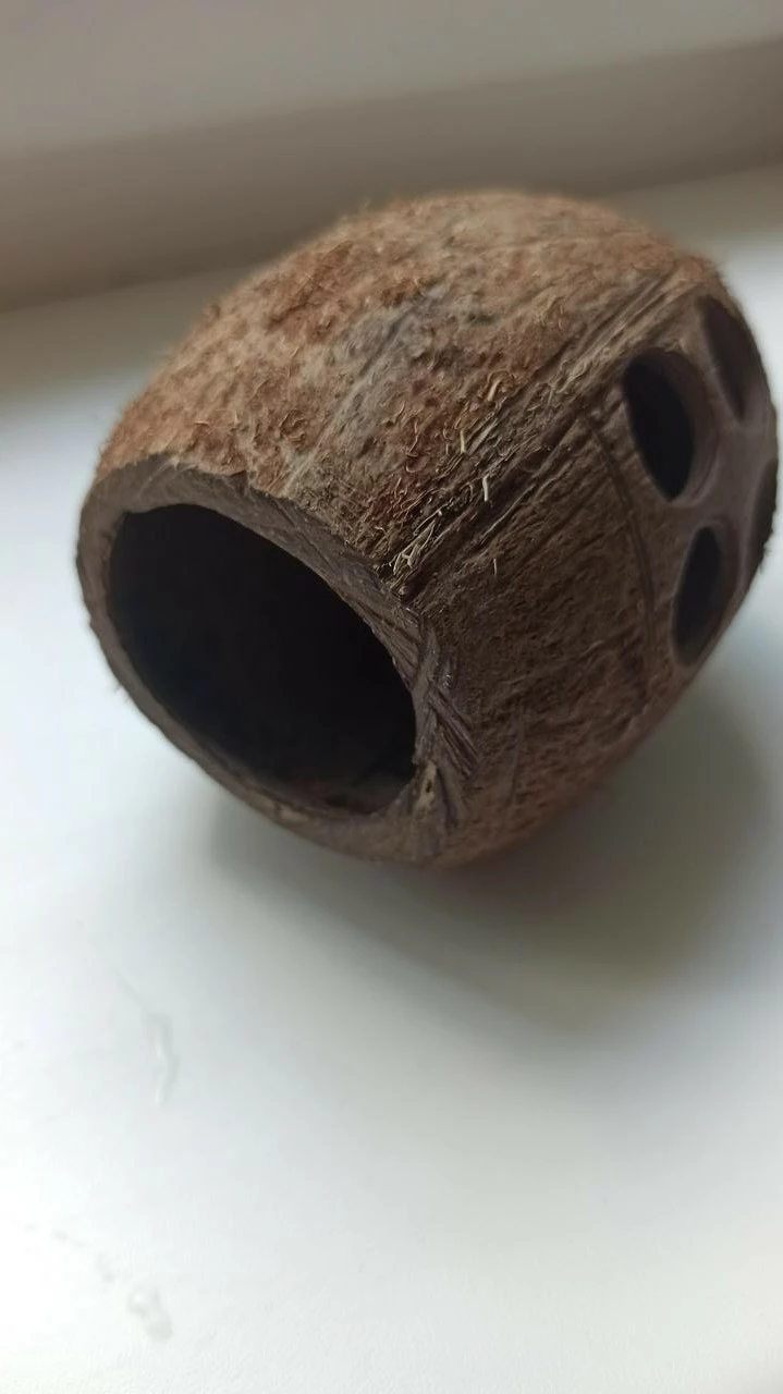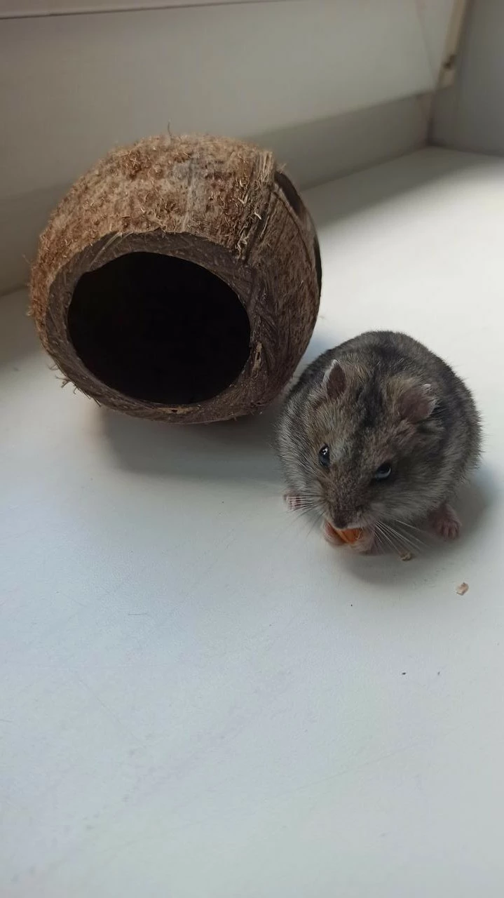 Домик для хомяка из кокоса с окошками. Экологически чистое жилище и убежище для вашего питомца. Кроме того, внутри кокоса можно обустроить туалет для хомяка. В этом случае на дно кокоса насыпают наполнитель для кошачьих туалетов. Хомяк быстро привыкает к туалету, и уход за клеткой существенно упрощается. Наполнитель нужно менять по мере необходимости.