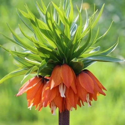 Фритиллярия Аврора - очень необычный цветок, часто называемый императорской или царской короной, или рябчиком. Цветонос высокий, часто достигает 1 м, сильный и безлиственный, на его верху красуется корона из листьев и колокольчиковидных цветов огненного окраса. Считается ярким украшением сада, сажать лучше группой, так посадки выглядят более естественно.