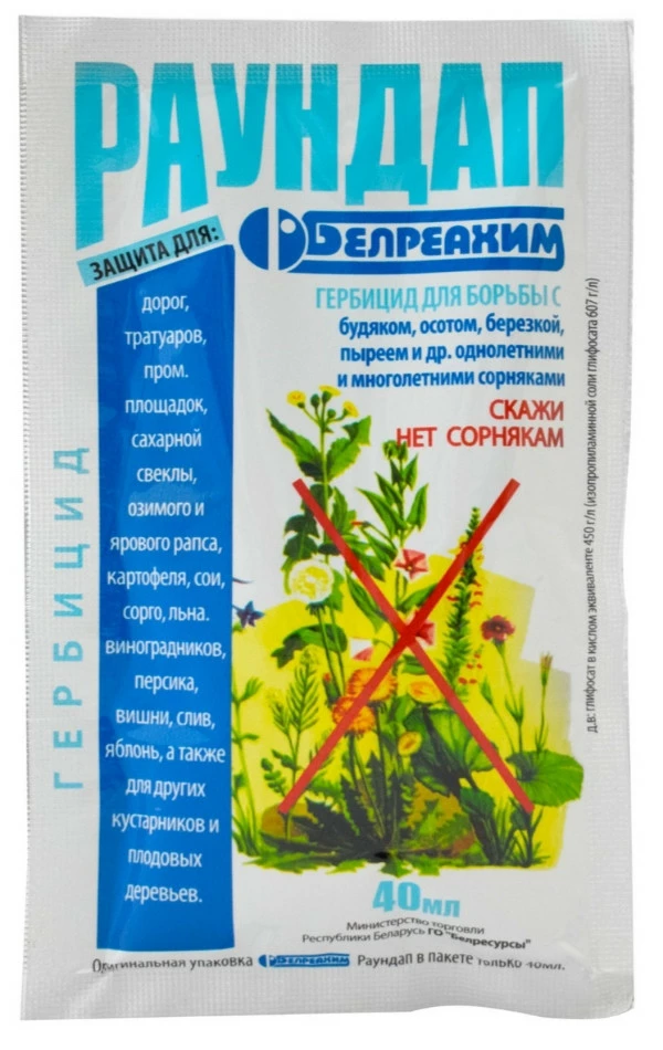 Раундап 40 мл - универсальное средство для борьбы с любыми видами сорняков, гербицид полностью уничтожает однолетние и многолетние, злаковые и двудольные сорняки, включая их наземные и подземные части. Действующее вещество: глифосат. Преимущества: - Уничтожение сорняков до того, как они успевают нанести ущерб культуре в критический период ее развития. - Уменьшение количества механических обработок, сохранение почвенной влаги - посев в оптимальные сроки. - Повышение полевой всхожести культур. Механизм действия: препарат проникает в растение только через листья или молодые побеги, не воздействует на растение через почву и не препятствует прорастанию семян. В почве препарат быстро теряет активность, а затем разлагается на естественные природные вещества. Применение: Раундап применяется весной для борьбы с однолетними и многолетними сорняками яровых культур. Обработку следует проводить не позднее чем за 3-5 дней до посева или до появления всходов культур. Раундап наносится на поверхность листьев или побегов, поглощается растением в течение 4-6 часов. Переносится в корни и другие части в течение 5-7 дней. Сорняк погибает в результате нарушения процесса синтеза аминокислот. Первые признаки действия препарата в виде пожелтения и увядания проявляются через 5-10 дней после применения. Полностью сорняки отмирают через 2-3 недели после обработки. Норма расхода: препарат 20-40 мл развести в 3-4 л воды (обработка 1 сотки). Опрыскивание проводят свежеприготовленным раствором в безветренную погоду.