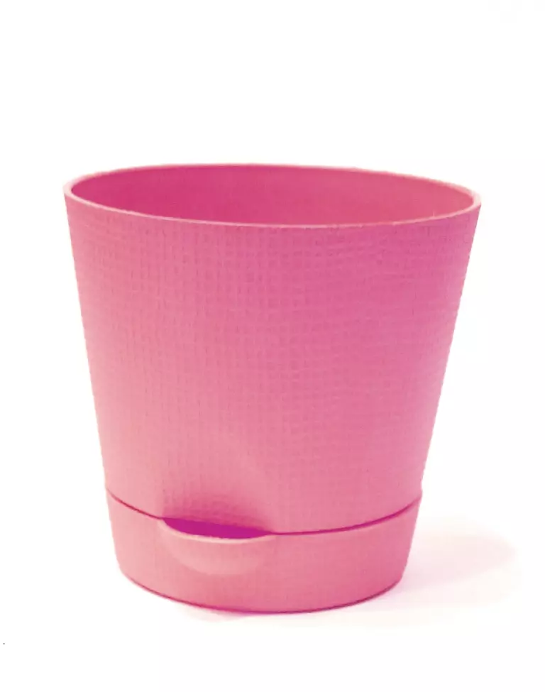 Пластиковый горшок для цветов 0.7 л. с системой прикорневого полива или нижний полив. Прикорневой полив осуществляется с помощью специального носика, который расположен в поддоне горшка. Корни растения получают столько влаги, сколько им положено, исключая их загнивание. Поддон крепится ко дну горшка специальными крепежами. Особая конструкция обеспечивает дренаж и вентиляцию корней растений. Особенность дизайна серии: яркие цвета и выраженная текстура поверхности.