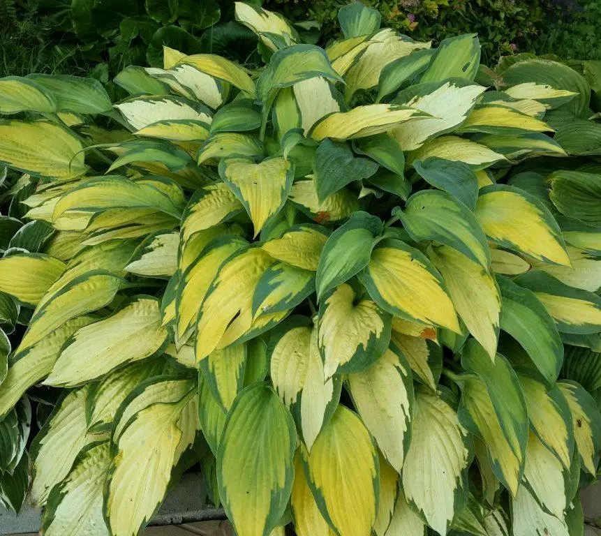 Хоста Голд Стандарт с листьями золотистого цвета и тонкой зеленой каймой подходит для миксбордеров, клумб, декорирования дорожек, крупных кустарников или берегов водоемов. Красивый многолетник, по отзывам садоводов, ценится за неприхотливость и любовь к тени.