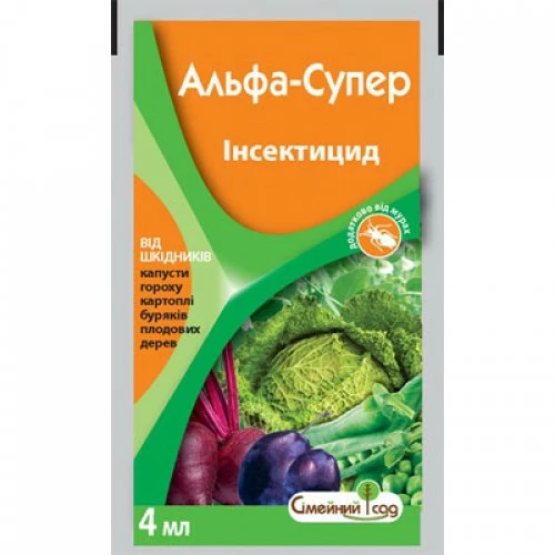 «Альфа-Супер» - высокоэффективный инсектицид контактно-кишечного действия от широкого спектра вредителей картофеля, капусты, свеклы, гороха, зерновых и плодовых культур, цветов. Эффективен против колорадского жука, литовертки, тли, пшеничного трипса, свекольной блошки, цикадки, совки, капустного и рапсового билана, долгоносика, плодожорки, медяницы, зерновки гороховой, лугового мотылька, рапсового цветоеда, саранчи, также может применяться в борьбе с садовыми муравьями для ликвидации муравейников. «Альфа-Супер» самый эффективный инсектицид в группе синтетических пиретроидов, который надежно удерживается на поверхности растений. Период защитного действия - 2-4 недели в зависимости от вида вредителей и погодных условий.Рекомендации по применению На 4 мл препарата приходится площадь обработки в 2-е сотки земли. Опрыскивание проводят в период вегетации, когда численность вредителей превышает допустимые нормы. Рабочий раствор готовят непосредственно перед применением и полностью используют в день приготовления. Бак опрыскивателя на 1/2 заполняют чистой водой, добавляют необходимую дозу «Альфа-Супер», все тщательно перемешивают, и доливают оставшееся количество воды. Обрабатывают культуры обеспечивая равномерное смачивание листьев, в безветренную погоду в утренние или вечерние часы, при температуре воздуха и почвы не выше +25 °С. Интервал между обработкой и возможным выпадением осадков не менее 3-4 часов.