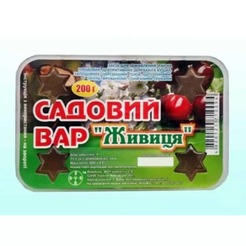 Препарат Садовый вар Живица (вязкое вещество) используется для заживления ран на деревьях и кустах. Состав — канифоль сосновая, петролатум, подсолнечное масло. Препарат садовый вар Живица препятствует проникновению насекомых-вредителей, грибков и бактерий в ткани растения. Останавливает соковыделение и способствует заживлению. Живица хорошо прилипает к свежим ранам и быстро затвердевает. Замазка не растекается от солнечных лучей и не растрескивается при морозе. Ранами считаются: сломанные ветки, отломанная часть ствола, повреждение коры и древесины дикими животными, спилы при формировании кроны дерева, повреждение коры и древесины в силу заболеваний. При механических повреждениях удаляются поломанные части дерева (куста), на свежий спил или поврежденный участок коры растения наносится тонкий слой садового вара Живица. При поражении инфекцией, частичном отмирании (загнивании) коры, следует срезать поврежденную часть до здоровой древесины. Место среза зачистить и продезинфицировать (обработать медным купоросом). Затем на обработанную рану нанести тонкий слой садового вара. Садовый вар Живица плотно закрывает рану, препятствуя высыханию и попаданию инфекции (вредителей, грибков и бактерий). Защитный слой садового вара следует обновлять каждую весну до полного заживления раны.