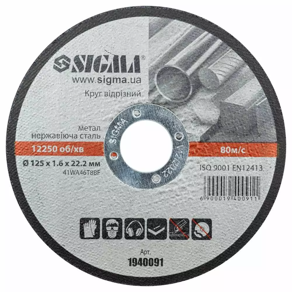 Круг отрезной по металлу и нержавеющей стали Ø125×1.6×22.2мм, 12250об/мин SIGMA (1940091) предназначен для резки изделий из металлов и нержавеющей стали, работы с кузовной сталью и другими аналогичными материалами. Рабочим инструментом при работе отрезного круга является угловая шлифовальная машина (УШМ, "болгарка"). Преимущества: Соответствие самым высоким европейским нормам безопасности и качества; Высокая режущая способность и низкая стоимость одного реза - отличное соотношение цены, качества, стойкости, производительности и надежности; Равномерный износ без выкрашивания во время работы при одинаково быстрой скорости резания, оптимальная твердость; Минимизация нагрева рабочей зоны - повышенная износостойкость; Мягкий рез - ровная резка материала, поверхность круга не затупляется; Отсутствие заусенцев, прижогов, вибрации - идеальная балансировка круга и посадочного кольца минимизируют вибрации во время работы, что позволяет получить качественный рез.