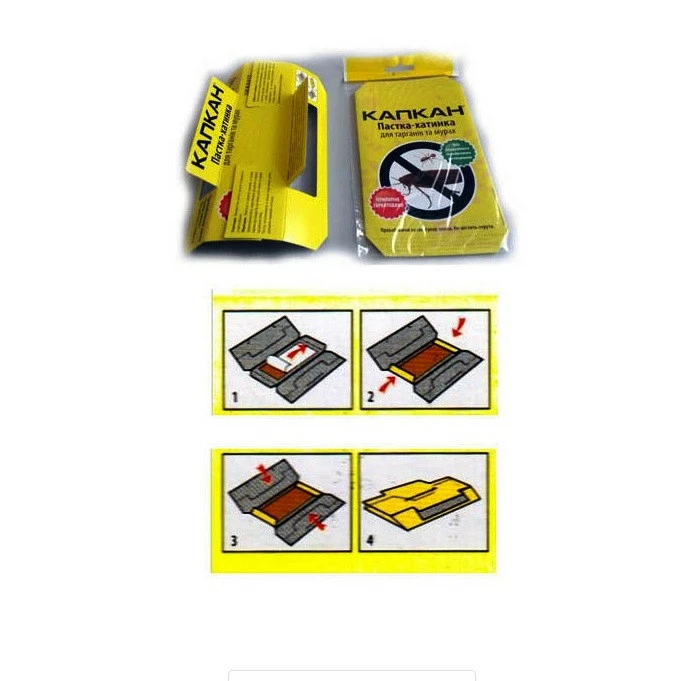 Домик-ловушка для насекомых «Капкан» — универсальное НЕТОКСИЧНОЕ средство для выявления и отлова тараканов, муравьев и других ползающих насекомых. Отличается высокой прилипаемостью, имеет привлекательный запах и не содержит отравы. Клеевая домик-ловушка «Капкан» проста в применении и может быть установлены в любом месте, в том числе в местах хранения пищевых продуктов. Разрешена к применению МОЗ Украины. Способ применения ловушки тараканов «Капкан»: Аккуратно открыть ловушку и отделить бумагу, закрывающую клей и сложить ловушку. Установить ловушку в местах вероятного скопления насекомых-вредителей и на пути их перемещения. Для достижения лучшего результата рекомендуется использовать несколько ловушек одновременно с расчета одна ловушка на 5-10 кв. м. Ежедневно осматривайте ловушки, если на протяжении 2-3 дней не было поймано ни одного вредителя, необходимо перенести ловушку в другое место. Замену ловушек производят по мере их заполнения насекомыми-вредителями.