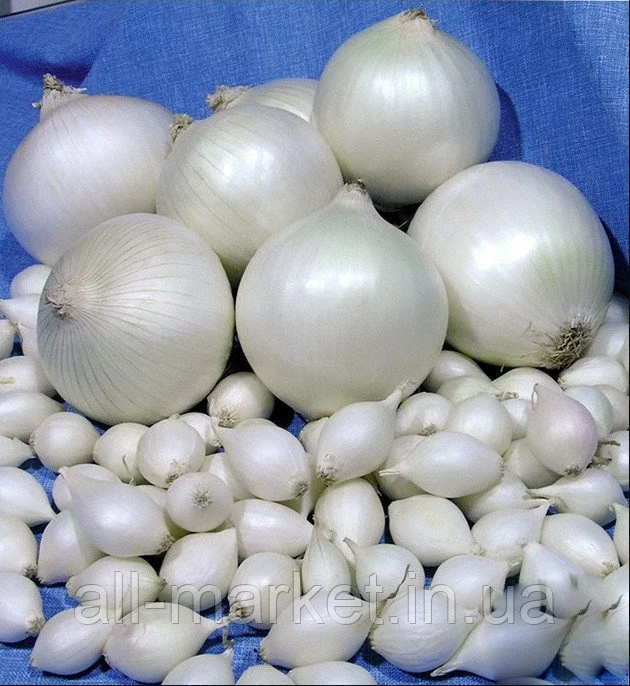 - Вид и форма: белая луковица округлой формы.