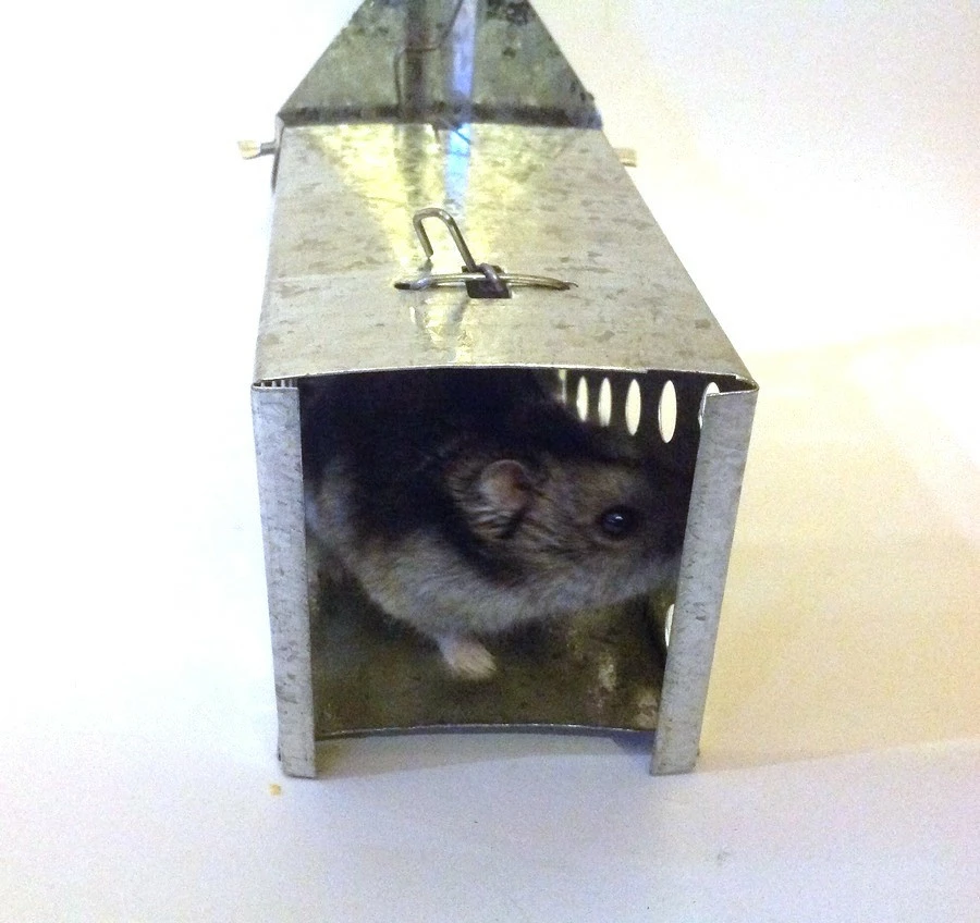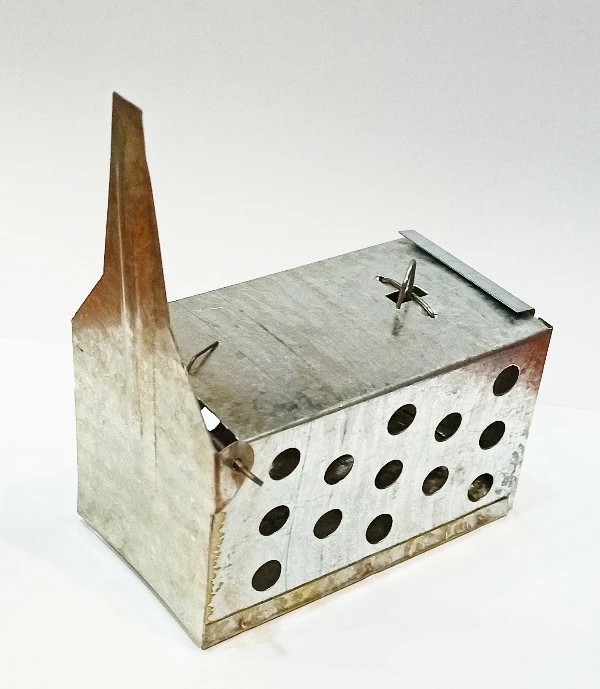 Простая, но в то же время эффективная, ловушка домик. Выбраться из такой ловушки у грызуна шансов нет. Такое устройство имеет вид коробки. Для того чтобы ловушка сработала, необходимо надеть приманку и открыть крышку. Крышка закрепляется тем же фиксатором, на который крепиться приманка, таким образом при малейшем соприкосновении к приманке ― ловушка захлопнется.