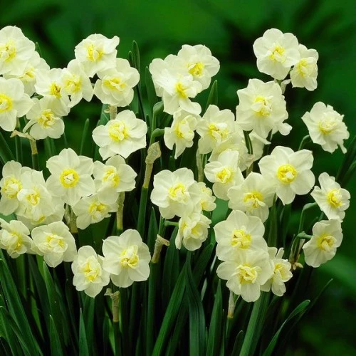 Многоцветковый нарцисс Cherfulness – луковичное, многолетнее, цветущее растение, которое активно используют для украшения клумб, для выращивания в горшках или контейнерах, а также для срезки в букеты. Имеют до 3-х соцветий на одном стебле, каждый из которых представляет собой кремово-белые, заостренные лепестки с бахромой по краям и желтой короной.