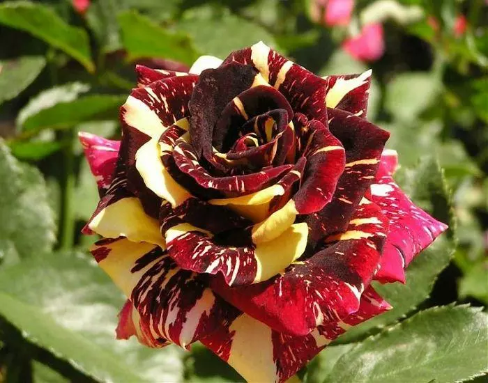 Описание сорта Роза Абракадабра представляет собой многолетнее растение, растущее в форме раскидистого или прямостоящего куста, а также в форме штамбового деревца высотой от 50 до 150см, с темно-зелеными шиповатыми стеблями. Крупные, диаметром от 7 до 12см, одиночно расположенные на высоком цветоносе или в соцветиях махровые цветки с высоким центром и заостренной формы лепестками и приятным стойким ароматом. Сорт Абракадабра особенно интересен и привлекателен тем, что расцветка цветков состоит из огромного количества всевозможных комбинаций цветов и оттенков красного, желтого, коричневого и белого цветов.