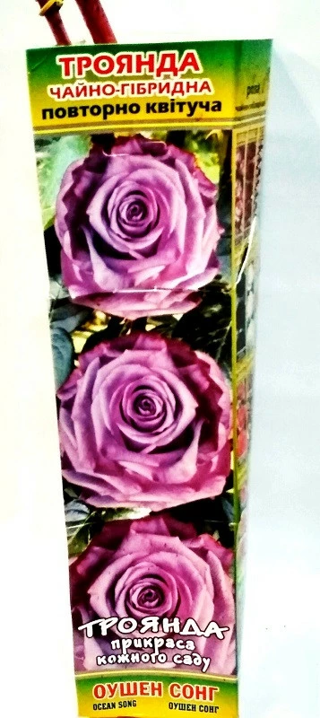 Роза Оушен Сонг имеет необычный лавандовый цвет лепестков, с фисташковым переходом к краю бутона. Цветок густомахровый - 40-50 лепестков, которые плотно уложены в бокал с высоким центром, при полном роспуске края лепестков сворачиваются в треугольники. Цветы крупные - 10 см в диаметре, обычно появляются по одному, на длинных побегах или собраны в кисти по 3-7 шт., хорошо переносят дожди и полуденное солнце. Сорт Оушен Сонг формирует прямые, мощные кусты высотой 120 см, 70 см в ширину. Сорт отлично выдерживает солнце, также может расти и в полутени.