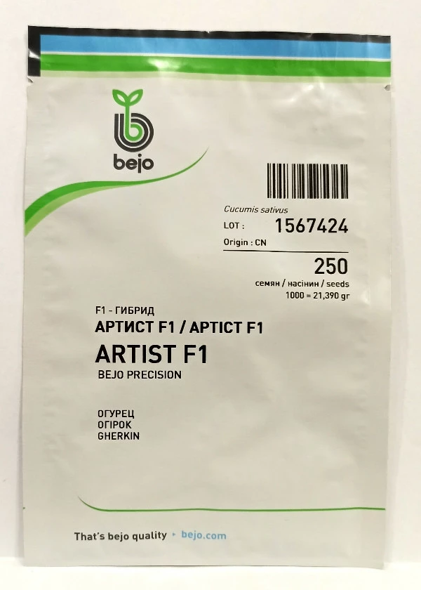 Гибрид партенокарпического раннего огурца Артист F1 начинает плодоносить через 40-46 дней после высадки рассады. Зеленцы крупнобугорчатые, темно-зеленые, не склонны к желтению, без горькости, длина к диаметру - 3,3:1. Растение мощное, имеет развитую корневую систему, в среднем в одном узле завязывает по 6-8 плодов. Быстро регенерируется после различных стрессов. На шпалере не склонно формировать боковые пасынки. Без проблем переносит условия низкой освещенности, что делает его идеальным выбором для возделывания в зимне-весенний период. Имеет толерантность к оливковой пятнистости, пероноспорозу и вирусу огуречной мозаики. Помимо свежего употребления, пригоден к маринованию. Стабильный урожай дает на протяжении всего сезона выращивания. Урожайность корнишонов свыше 20-25 кг/кв.м..