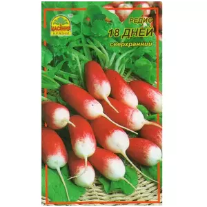 Редис 18 днів. Сорт суперранній. Від сходів до дозрівання коренеплодів 18-20 діб. Коренеплоди подовженої форми, великі, масою 15-20 г, ярко-червоного кольору, з білим кінчиком. М’якоть ніжна, соковита, більш пікантна, ніж в інших сортів.