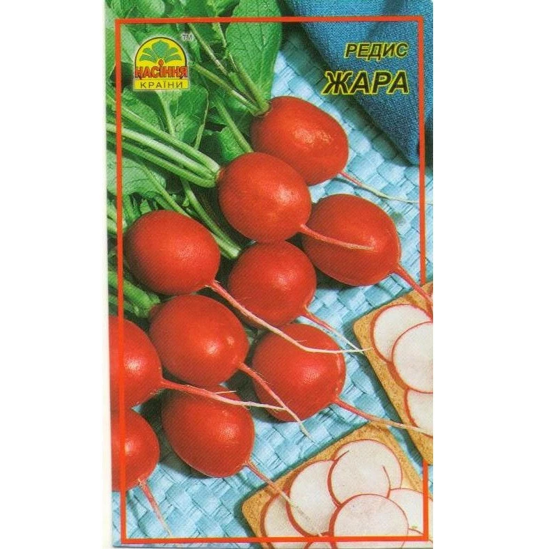 Редис жара. Сорт раннеспелый, от посева до начала потребления 18-20 дней. Корнеплоды гладкие, округлые, красно-малинового цвета, имеют приятный слабоострый вкус. Используется для ранней выгонки в открытом и закрытом грунте. Очень урожайный. Схема посадки 9×3 см