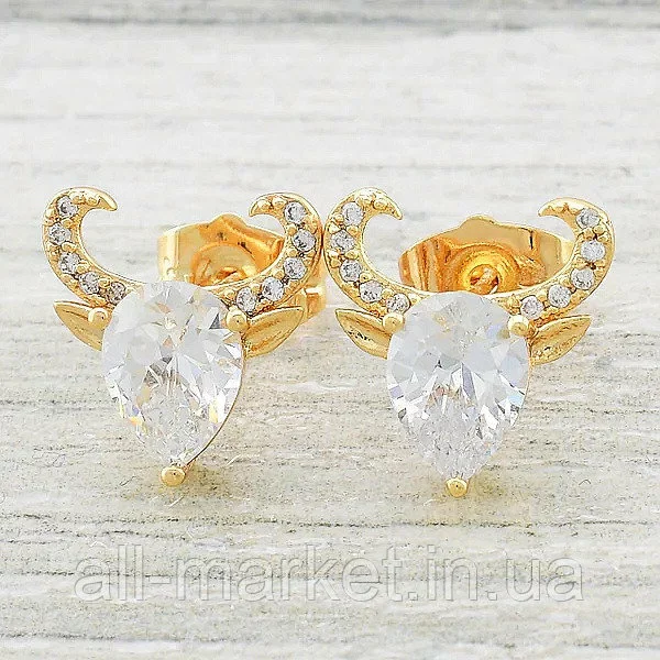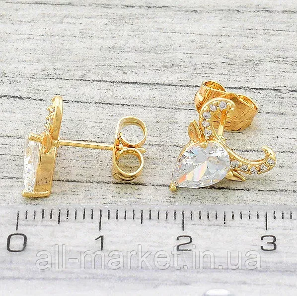 Серьги гвоздики Бычки : размер 13х12 мм,куб. цирконий, вес 2.2 г, позолота 18К