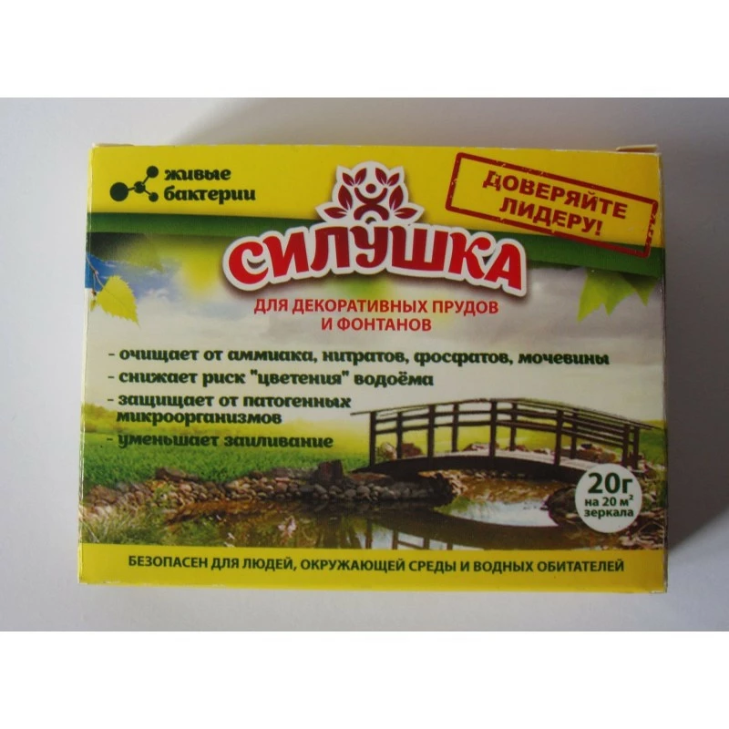 Биопрепарат "Силушка" для ставков и фонтанов. Понижает риск цветения воды, заиливания, улучшает прозрачность воды, положительно влияет на водных обитателей (рыба, ракоподобные моллюски). Норма расхода - 20 г на водоем площадью до 20 кв.м.