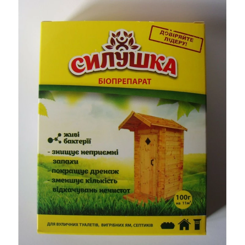 Биопрепарат “СИЛУШКА” для туалетов, выгребных ям, и биосептиков. Удаляет неприятные запахи, улучшает дренаж воды, уменьшает количество откачиваний, расщепляет нечистоты на воду и ил. Норма расхода — 100 г применяется на объем 11 куб. м нечистот.