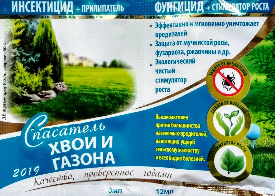 Способ применения: растворить в содержимое 2-х пакетов в 10 л воды. Раствор тщательно размешать и обработать 1-2 сотки.