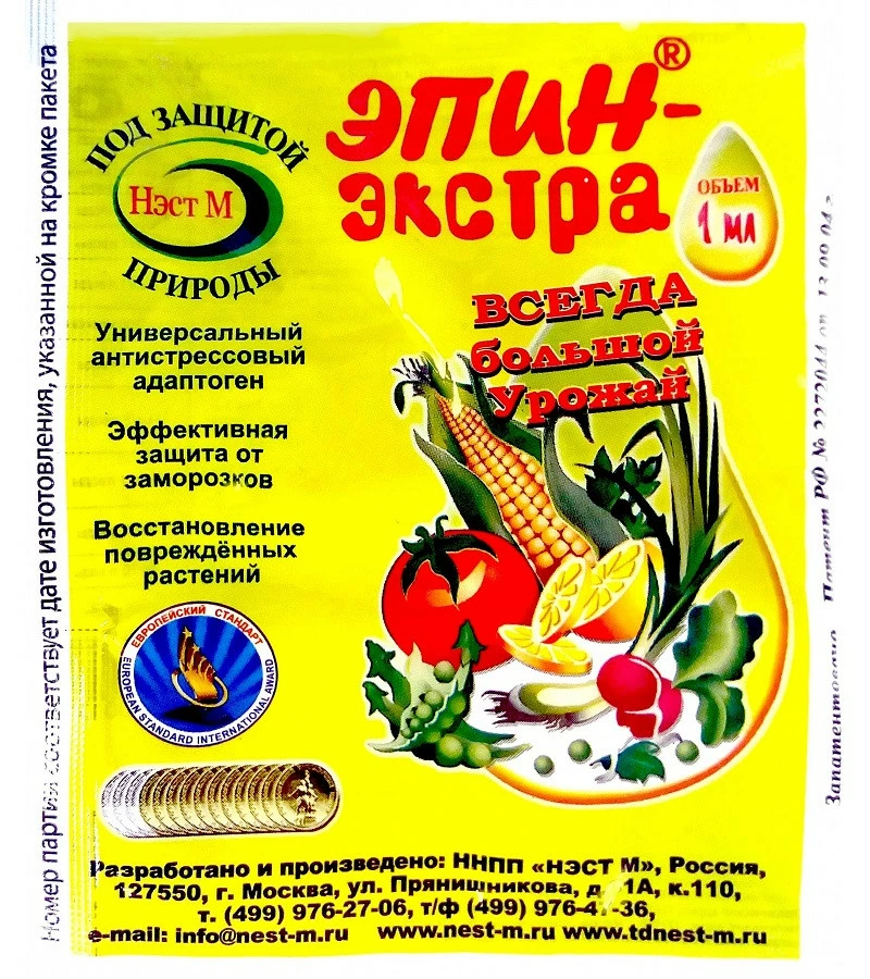 Антистрессовый адаптоген для растений. Обязательно должен быть в "садовой аптечке" каждого дачника! Незаменимый помощник при неблагоприятных погодных условиях: град, резкое снижение температуры. Своевременная обработка подготовит растение к заморозкам и поможет быстро восстановиться после. Эпин плюс ускорит прорастание семян, поможет окрепнуть ослабленным всходам. Помимо этого, стимулятор является прекрасным укоренителем для растений. Назначение - для овощных, цветочных и плодово-ягодных культур. Сроки применения - в период вегетации растения. Норма расхода: Замачивание семян - 2-3 капли препарата на 100 мл воды (замочить на 2-4 часа). Обработка луковиц - 0,5 мл препарата на 1 л воды (опрыскать или замочить на 2-4 часа). Рассада - 0,2 мл препарата на 1 л воды (опрыскать за сутки перед высадкой в открытый грунт или сразу после высадки). Овощные культуры - 1 мл на 5 л воды (опрыскать в фазе 2-3 настоящих листьев); 0,5 мл на 1 л воды обработать сразу после заморозков. Плодовые и ягодные культуры - 1 мл на 5 л воды (опрыскать в фазу бутонизации и через 15-20 дней после цветения), 1 мл на 10 л воды (опрыскать до опадания листьев).