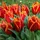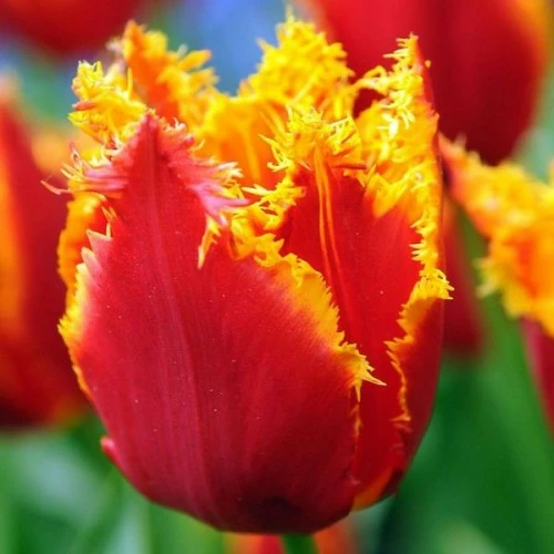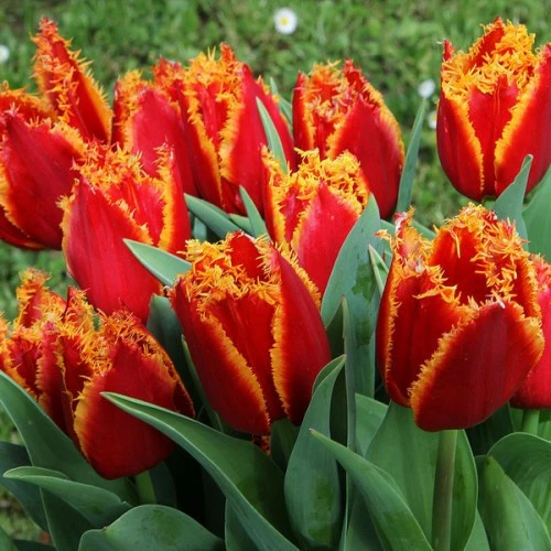 Тюльпан Бахромчатый Fabio — лучший сорт для выгонки. Ярко-красные лепестки украшены золотистой бахромой, которая напоминает язычки пламени. Поэтому кажется, что бутон тюльпана пылает на крепком высоком стебле. Цветок неприхотлив к условиям выращивания и морозоустойчив (до -33 градусов). Первые тюльпаны Фабио зацветают с 15-х чисел мая, поэтому их относят к поздним сортам. Их цветение длится около 2 недель в открытом грунте.