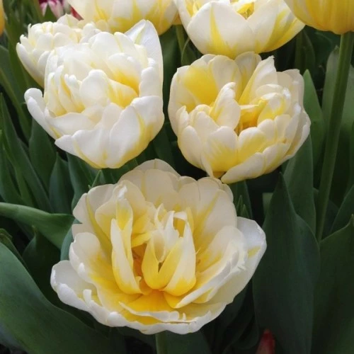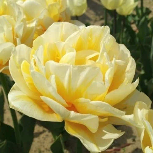 Махровый тюльпан Фламинг Евита молочно-ванильного цвета ценится за свою необычную красоту. Его пышный бутон цветет не менее 3 недель, источая тонкий приятный аромат. Его бутон по строению напоминает пион, он содержит в два раза больше лепестков, чем обычный сорт и хорошо держат форму.