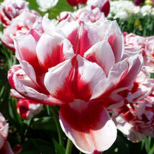 Воздушный махровый тюльпан Горизонт с нижней частью лепестков красно-розовых и верхней молочно-белой, часто сравнивают с клубникой со сливками из-за его окраса и легкого фруктового аромата. Высаживают их в городских парках и частных садах, используют для контейнерного выращивания и срезки. Цветок неприхотлив и легок в уходе, что ценится всеми цветоводами Украины.