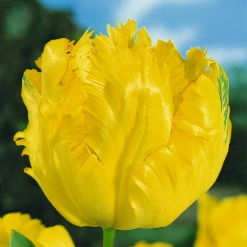 Золотистый тюльпан Техас Голд относится к попугайным сортам. Его ярко-желтая окраска подчеркнута тончайшей бордовой полосой, которая идет по рваному гофрированному краю лепестков. Среди отзывов об этом сорте, часто встречаются не только упоминания о его красоте, но и о его неприхотливости и длительном цветении. В срезке Техас Голд ведет себя великолепно, долго сохраняет красоту и свежести, и готов радовать владельцев не менее 1,5 недель.