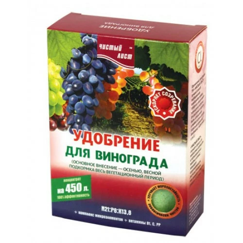 Чистый лист — высокоэффективное комплексное удобрение для винограда. Применяется для подкормки виноградной лозы в течение всего сезона. Может быть использовано для полива, опрыскивания и сухого внесения в грунт. Полностью растворяется в воде и отлично сочетается с органическими удобрениями и пестицидами. Удобрение представляет собой сбалансированный комплекс макро- и микроэлементов + витамины + фитогормоны. В состав входят: азот, фосфор, калий, магний, железо, цинк, молибден, медь, марганец, кобальт, витамины (тиамин, аскорбиновая кислота, никотиновая кислота). Благодаря наличию железа и магния, не угнетаются процессы образования хлорофилла. Эффективность препарата повышается при регулярном поливе.