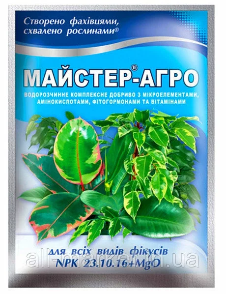 Удобрение Мастер Агро для фикусов — это специальное, высокоэффективное, бесхлорное, водорастворимое, комплексное удобрение. Предназначено для подкормки всех видов фикусов (асперы, бартерии, бенджамина, дельтоидеи, лираты, пумилы, религиозы, рубигинозы, сагитаты, эластики и др. ).