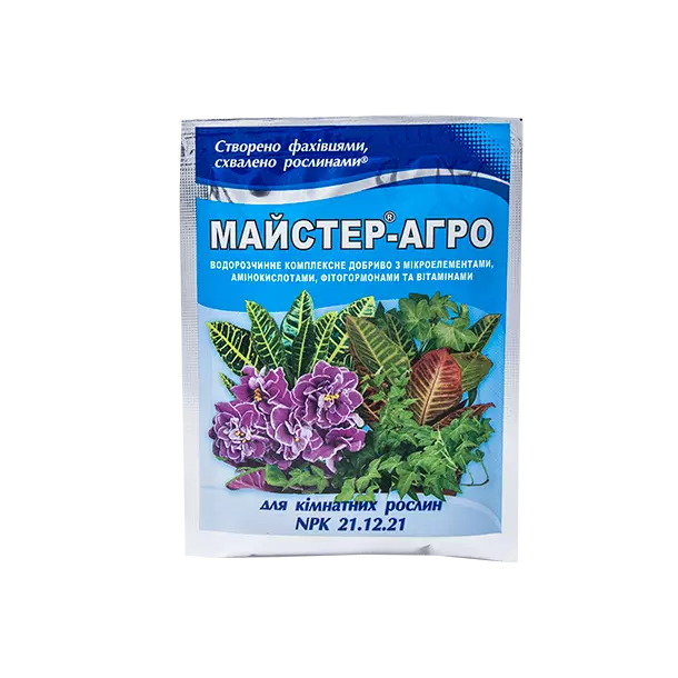 Мастер-Агро для комнатных растений (25 гр) - эффективное водорастворимое, безхлорное комплексное удобрение с микроэлементами в форме хелатов. Применяется для корневой подкормки, при выращивании комнатных балконных и декоративно-лиственных растений.