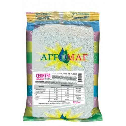 Кальциевая селитра (Азотнокислый кальций) Содержит: кальций (Са) - 19%, азот (N-NO3) - 15,5%. В воде растворяется замечательно и легко усваивается растениями.